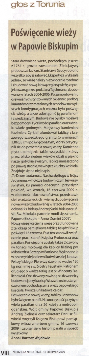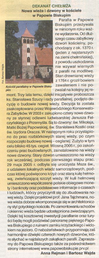 Parafia w Papowie Biskupim przeżywała ostatnio ważne wydarzenia. Od dłuższego czasu zabytkowy pokrzyżacki dzwon z około 1370 roku (jeden z najstarszych na ziemi chełmińskiej) z powodu uszkodzenia nie wzywał na modlitwę wiernych z parafii. Stan drewnianej wieży z roku 1764 groził zawaleniem i nie pozwalał na kolejny jej remont. Dzięki inicjatywie księdza proboszcza Stanisława Szucy i rady parafialnej trzy lata temu podjęto decyzję o budowie nowej wieży. Pomysł ten został zaakceptowany przez wojewódzkiego konserwatora zabytków.