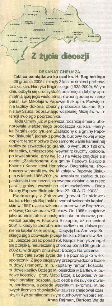 Dnia 26 grudnia 2005 r. minęły trzy lata od śmierci proboszcza ks. kan. Henryka Bagińskiego (1932-2002). W tym dniu odbyła się uroczystość odsłonięcia tablicy upamiętniającej jego wieloletnią i owocną pracę na rzecz parafii p.w. św. Mikołaja w Papowie Biskupim. Poświęcenia tablicy dokonał obecny proboszcz ks. kan. Stanisław Szuca, odprawiając wcześniej mszę świętą w intencji swego poprzednika.